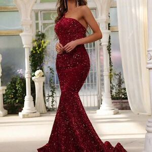 Burgundy Preppy Womens One Shoulder Mermaid Hem Sequin Formal Dress
