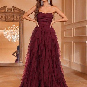 Burgundy Preppy Womens Solid Ruched Tube Wedding Dress