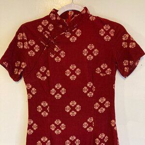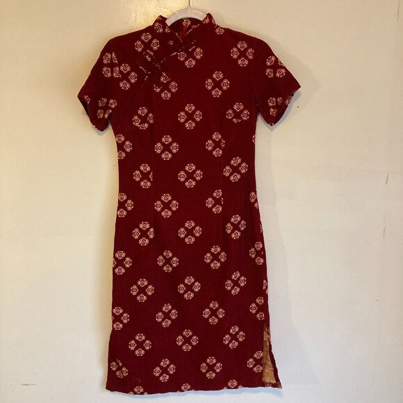 Burgundy Qipao Cheongsam Dress Corded Cotton Asian Y2K Small