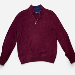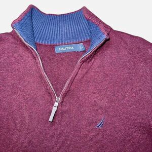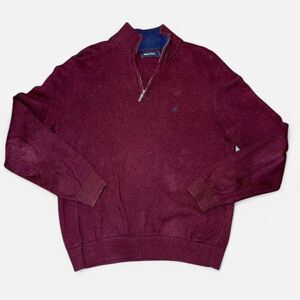 Burgundy quarter zip sweater in size MENS MEDIUM. Has navy Nautica logo on the breast and silver zipper on front. Thick high quality 100% cotton sweater material. Like-new condition with no flaws!