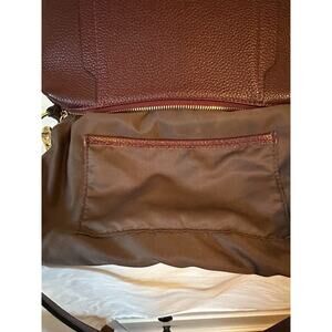 I ordered this bag some time ago and used it once. Not a major brand and the web site said it was leather but I cannot find a mark or tag so I’m pricing it as such. Very nice bag with nice clean lining and zipper top. Please see all photos. No flaws, rips, tears or stains. The back zipper is not as smooth as I’d like but I will add some zipper glide to it. Thanks for looking!