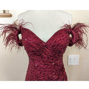 Burgundy Red Off the Shoulder Sequin & Feather Formal Prom Evening Dress