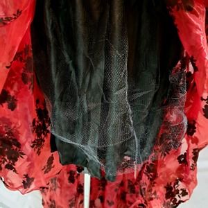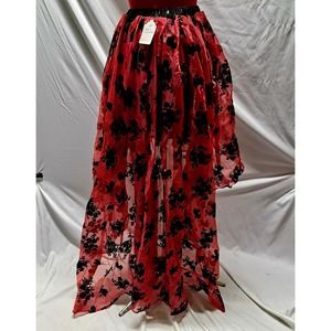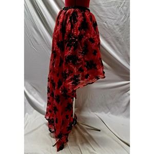 NWT Boutique Red sheer high low black flocked floral elastic waist pleated skirt. Black lining with crinoline piece. Victorian, Vintage, Royal Court, Corset, Wedding, Valentines Day, Cosplay, Carnival, Festival fancy skirt.
