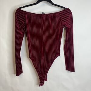 Burgundy Ribbed Sheer Wide Neck Bodysuit Sz Medium