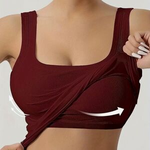 Extra comfy with stitched in shelf bra and removable modesty pads. Smoothing look layered under sweaters and sheer blouses. (see green floral blouse). Rich burgundy opaque rib knit looks good alone - like temperature control ;-)