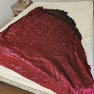 Item: Extra large round tablecloth in a shiny deep burgundy red color with a crinkled, textured finish.