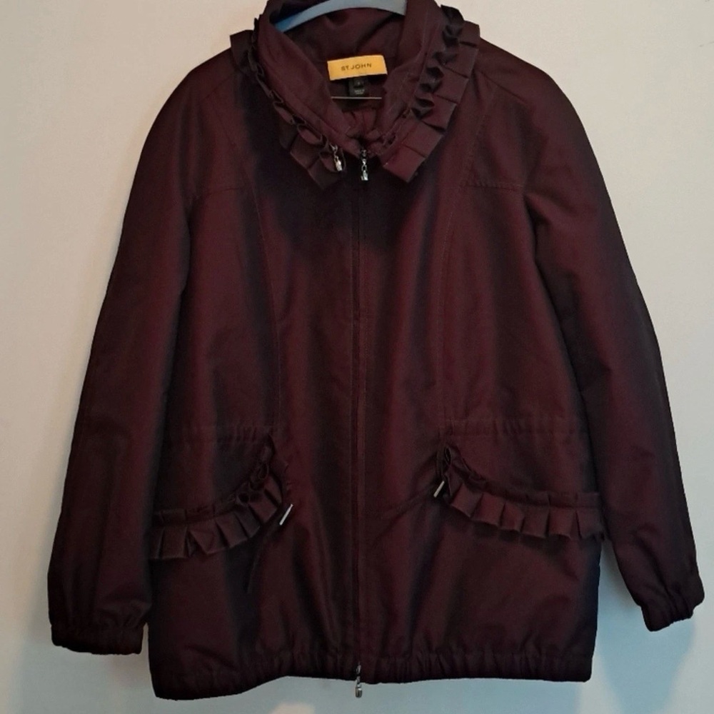 Stylish burgundy jacket with ruffle details. Perfect for a chic look. St. John size small