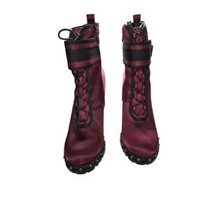 Burgundy Satin High-Heel Combat Boots Studded Soles Womens Size 7