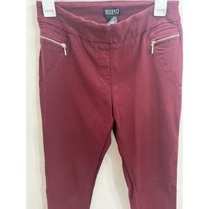 Elevate your wardrobe with these burgundy jeggings from Soho Apparel LTD. These pants feature a classic fit and a skinny leg style that flatters every figure. Made with a blend of nylon, spandex, and rayon canvas, these pants offer a comfortable stretch that moves with you. The pants are perfect for any occasion with their versatile color and fabric type. The jeggings come in a size medium and are ideal for regular sized women. Add these to your wardrobe for a stylish and comfortable option that can be dressed up or down.