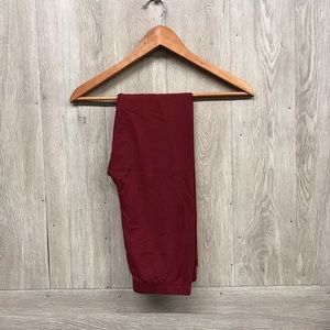 Soft Brushed Leggings in burgundy . These are one size and fit up to a size 12 comfortably. 92% Polyester. 8% Spandex.