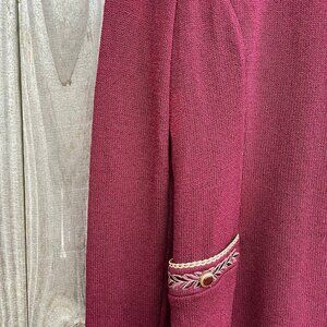 Exquisite burgundy knit St John jacket with gold trim and polished, translucent buttons edged in gold, leafy gold vine decoration.