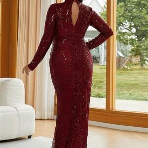 Burgundy Stand Collar Sequined Slit Long Sleeve Maxi Gown