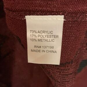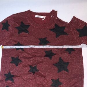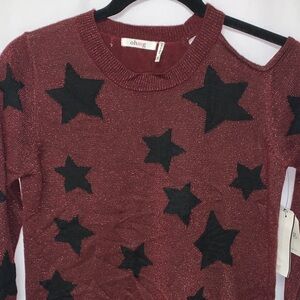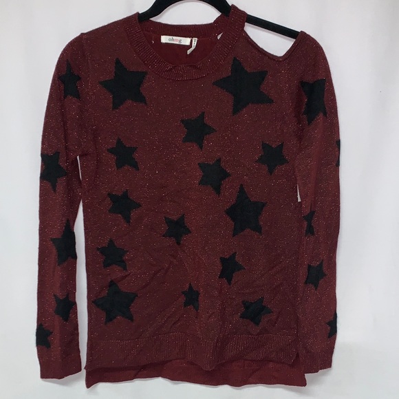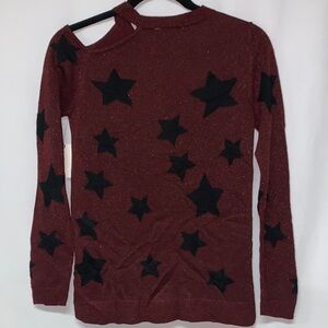Burgundy pullover with black star pattern. Features a shoulder cutout and shiny fabric for a stylish design.