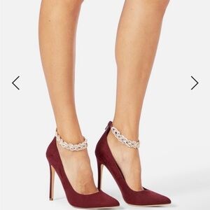 These pumps are characterized by their deep burgundy color and pointed toe design, complemented by an intricate, beaded ankle strap that adds a touch of elegance