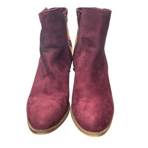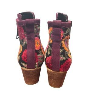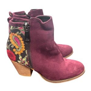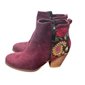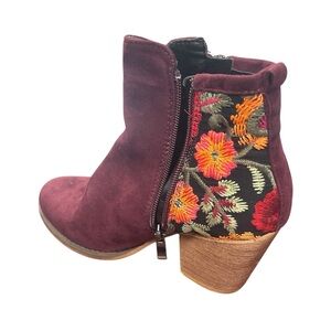 Burgundy Suede Ankle Boots Floral Embroidered Accents Western Block Heel