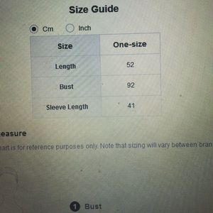 Sweater purchased from Shein.com One size fits all size. Was not long enough for my daughters purpose. Never worn