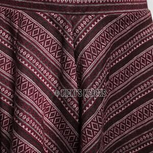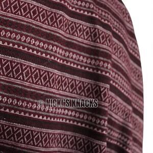 Burgundy and cream mini skirt with bold tribal-inspired chevron stripes and flared silhouette. Lightweight and ultra-soft with pull-on styling and elastic waistband. Mid-rise fit and comfy stretch make it a go-to for casual Y2K outfits, festival wear, or laid-back layering with tanks and crop tops.