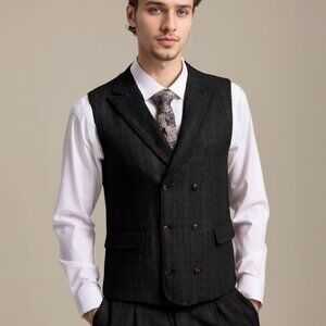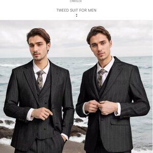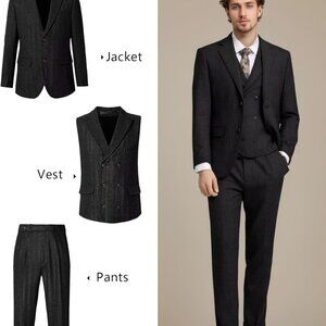 Features: Classic 3-piece suit with a tailored fit, featuring a notch lapel jacket with two buttons, a double-breasted vest with six buttons and an adjustable back tie, and flat-front pants with a zipper fly and button ends. Made from high-quality, breathable tweed that feels comfortable and looks sharp.