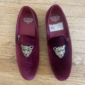 Step out in style with these luxurious burgundy velvet loafers from . Featuring a striking leopard accent, these slip-ons are perfect for adding a touch of elegance to any outfit.