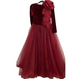 Burgundy red velvet and tulle long sleeve maxi gown with oversized rosette and cascading ruffle detail. Luxurious velvet bodice meets a full, flowing tulle skirt for maximum drama—perfect for Burning Man, festivals, costume parties, gothic or vintage-inspired weddings, and holiday events. Back view features a clean, elegant finish for a striking silhouette from every angle. Measures approx. 58" length, 15" bust, 15" waist, 18" hip. Best fits Women’s XS–S or Juniors 3–5; could work for a tall teen (Youth 14–16) for floor length. Note: Tear in tulle skirt as shown—priced accordingly.