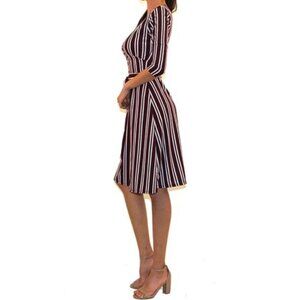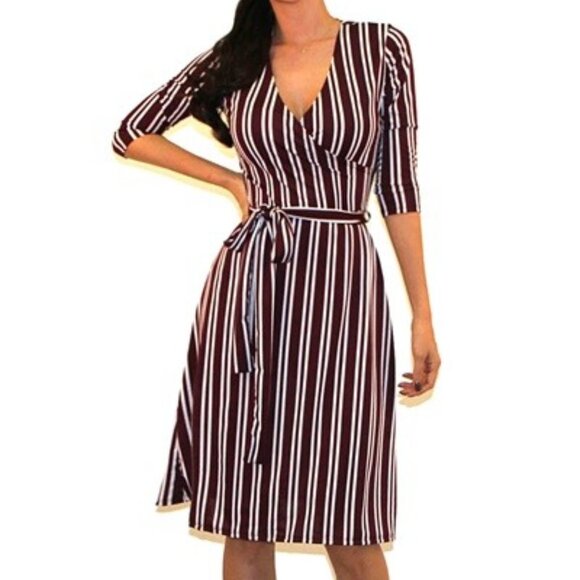 Burgundy White Stripe Faux Wrap Knee Length Dress