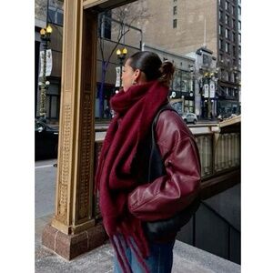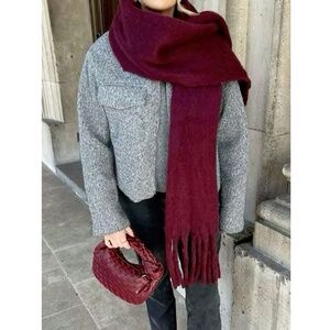 Burgundy Wide Shawl Scarf With Tassels Fuzzy Knit
