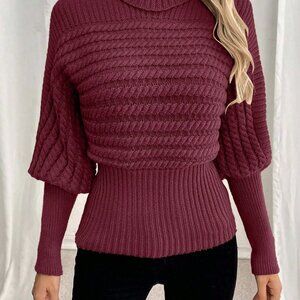 Burgundy Women's Casual Turtleneck Cable Knit Oversized Pullover Sweater