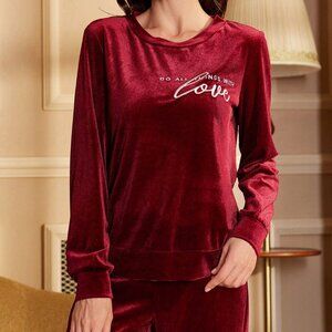 Burgundy Women's Contrast Color Letter Embroidered Velvet Lounge set