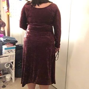 Pretty crushed velvet dress. Super comfy and perfect for Holiday parties! It’s a size M, but I’m a 1x and a 40 DDD and it fits me fine. Good used condition. Tea length.