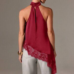 Burgundy elegant Women's Sleeveless High Neck Lace Trim Asymmetric Satin Top
