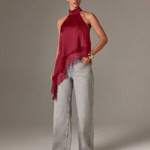 Burgundy elegant Women's Sleeveless High Neck Lace Trim Asymmetric Satin Top
