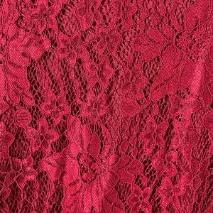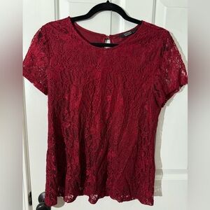 Pretty burgundy blouse, perfect for the holidays! The top layer is lace but the under layer is lined so it’s not see through. Very comfy and fits TTS! In great condition with no visible flaws.