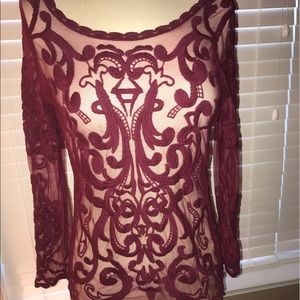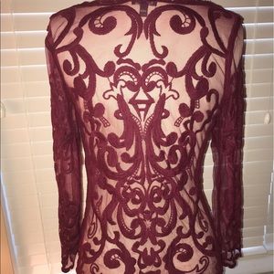 Burgundy long sleeve embroidered mesh top. BNWOT.