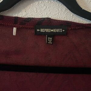 2X; Plus size burgundy cardigan with front pockets and a black pattern. Perfect for fall