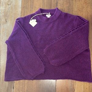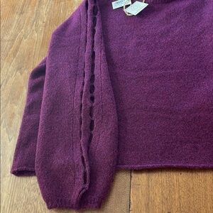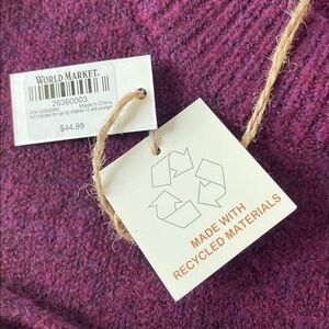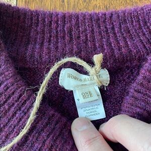 This is a new burgundy, plum, or wine colored sweater from World Market. It is soft and beautiful with nice details on the sleeves. See photos for details. The size is: "One Size", looks like M/L, see measurements below. The last photo depicts the style, but I the sweater I am selling is plum, wine color.
