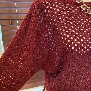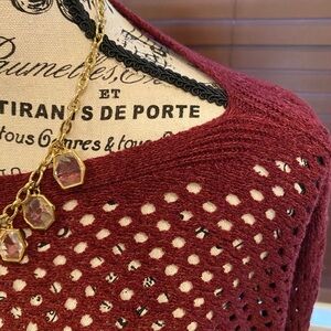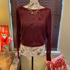 This is a gorgeous burgundy sweater that has a bit of a bat wing and has holes through so you can use a cami underneath.