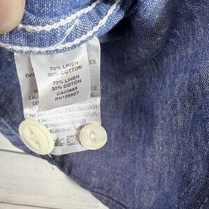 In great condition. Chambray denim long sleeve. Button closure. Collared. Two front pockets. Cotton/linen blend. Refer to pictures for measurements. From smoke-free/pet-free home.