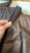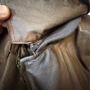 Brown genuine leather bomber jacket. Front hand slip pockets, banded hem, YKK zipper with pull tab, hidden inner pocket, light layer of insulation between leather and polyester lining. Another cool feature is that the leather tab collar zips off! Then it just has the fabric collar that matches the cuffs and hem. I added a video to show.