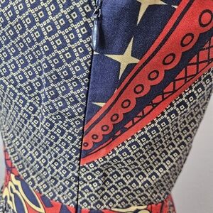 This burlapp dress is a stunning and chic designer piece in a geometric multicolor pattern. Featuring a V-neckline, sleeveless style, and a banded waist, it is perfect for various occasions like weddings, parties, or workwear. Made from 100% cotton, it has a pull-over design with a side zipper closure and is slightly above the knee in length. This mini dress with a mod and stylish theme is ideal for the summer, fall, or spring seasons.
