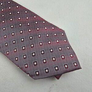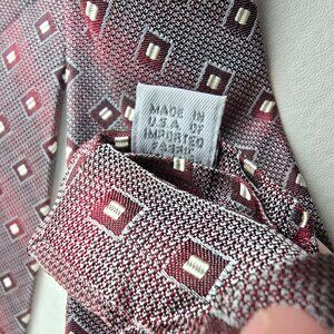 Sophisticated Burma Bibas tie in a red and silver geometric diamond pattern. Crafted in the USA using imported fabric, this sharp silk tie adds refined detail to any suit. Clean and well-kept with no major flaws. Excellent pre-owned condition.