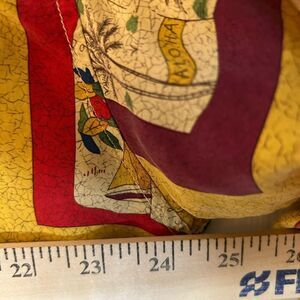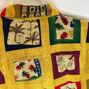 Vintage, RARE 100% Silk Burma Bibas Short Sleeve Shirt with Hawaiian Style Print pattern! This features a collage of palm trees and pineapples! It is in excellent used condition with no rips tears or stains.