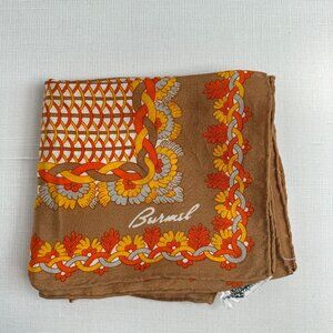 This vintage Burmel silk scarf features a bold floral and geometric print in brown, orange, yellow, and white. Made in Japan, it is crafted from 100% silk with a hand-rolled hem and measures 25 x 25 inches—a collectible piece from a well-regarded mid-century maker, perfect for adding a retro touch to any wardrobe.
