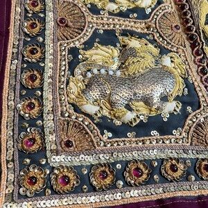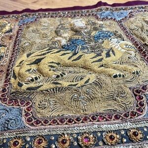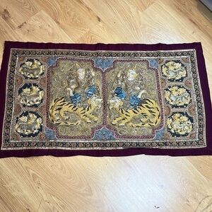 This is a beautiful Burmese Kalaga Large Tapestry Tigers Dragons Riders 40” x 23” Handmade in Burma. All the beads look to be in place. Gray backing and background with a wine maroon cotton framing and back. Riders in parade at play at center with raised batting, sequins, glass beads and metallic woven cotton threads. Loops can be added at any dry cleaner or seamstress to hand on rod. Or this would be beautiful once framed. No issues. No odors.
