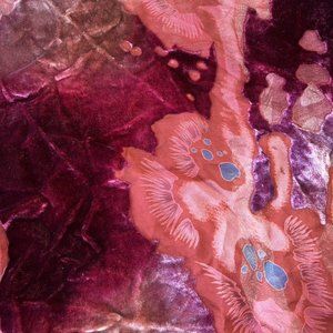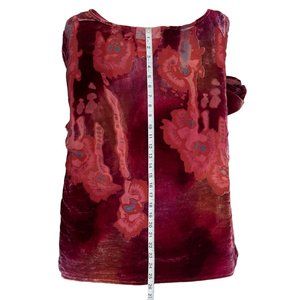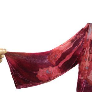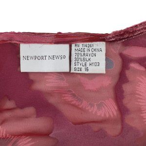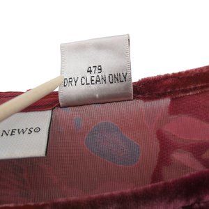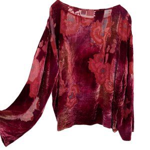 Burn out velvet pullover blouse in burgundy, deep mauve, and pink by Newport News. Is see through in parts when held up to light. Picture 4 is in bright light. Crew neck. Wide sleeves. Women's size 16. 70% Rayon, 30% Silk. Clean and in excellent pre-owned condition.