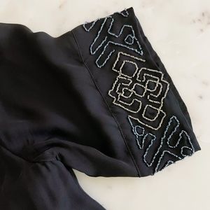 Gorgeous detailed beading in blue, silver, copper and gold along neckline, sleeves and hemline