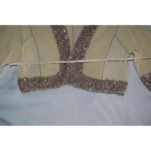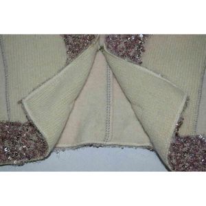 The cashmere is from recycled cashmere sweaters so there are natural imperfections and differences in tone throughout. The sequin trim is very delicate and there are areas where a few sequins have fallen off - no large holes or noticeable bare spots - see pictures. Previously loved with tons of life left. Please see all pictures as part of description, for condition, and for measurements.