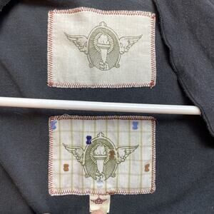 Some minor wear on the embroidery (pictured). In otherwise great preowned condition with minor to no signs of wear. The black is not a jet black, more of a smoky faded black.