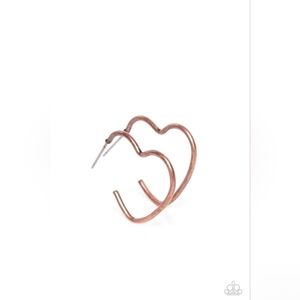 A simple hoop of copper curves around the ear into a heart-shaped frame. Its curls are complemented by its antiqued sheen finish, leaving a lasting impression. Earring attaches to a standard post fitting. Hoop measures approximately 1" in diameter.
