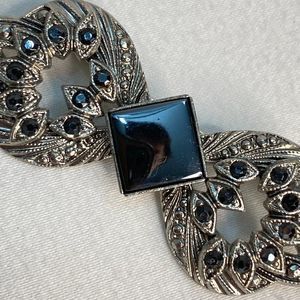 Burnished Silver Brooch Ornate Bow Black Square Central Stone Black Rhinestones