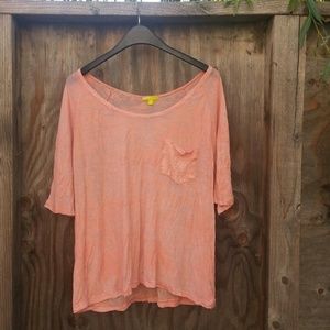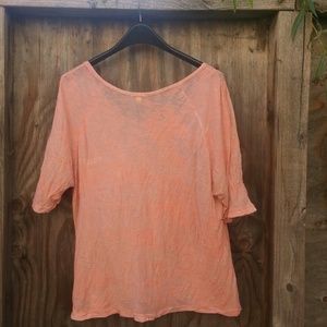 This tee has three indignations on picture 3. It is a burnout coral tee, the indignations were not intentional, but suit the look of the tee well and hardly noticeable. 50% polyester 50% cotton.